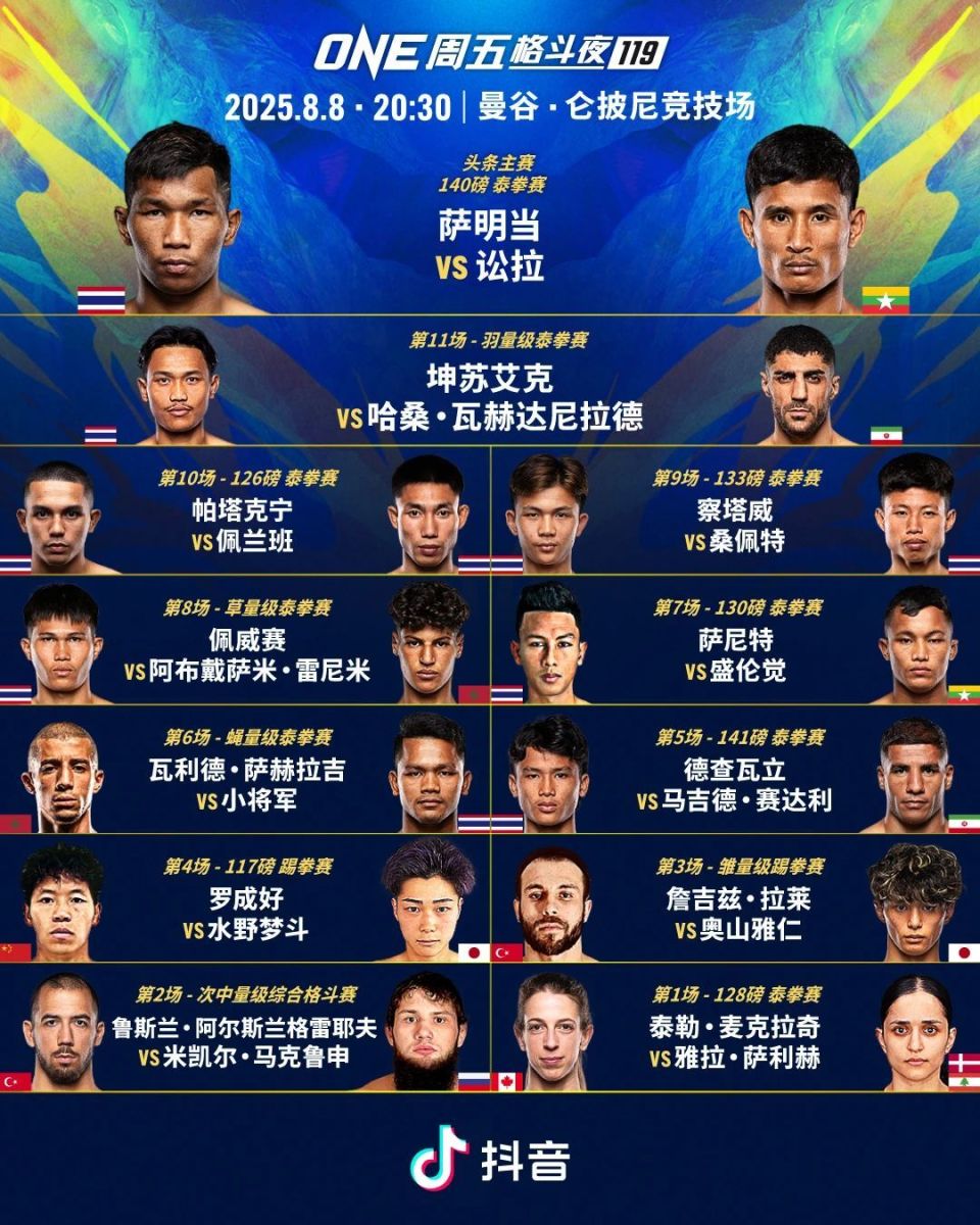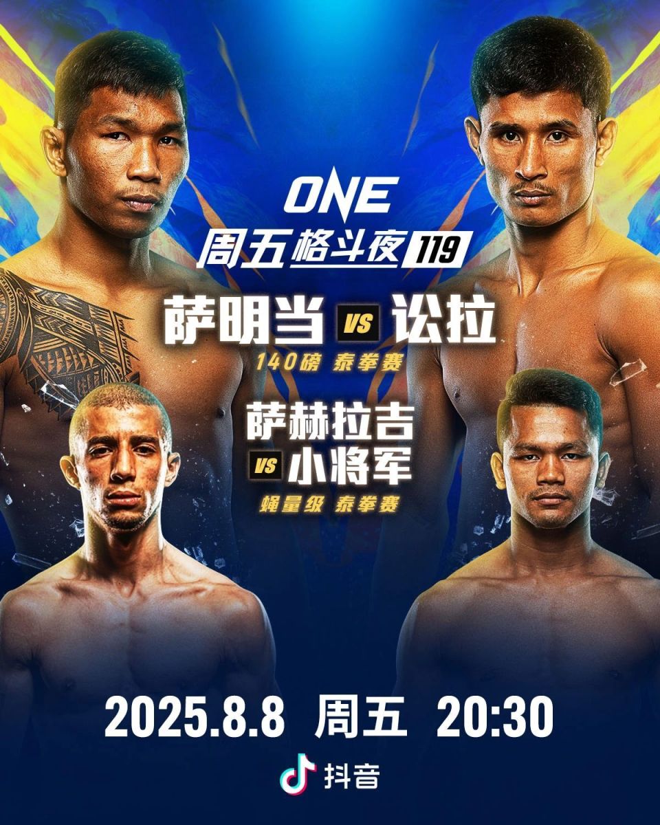 8月8日,曼谷夜空将再度被仑披尼竞技场的聚光灯点燃,“ONE周五格斗夜119“头条主赛将上演一场关乎荣耀与未来的140磅泰拳大战——23岁的泰国新锐萨明当迎战缅甸悍将讼拉。对于刚刚两连胜的萨明当而言,这不仅是一场普通的较量,更是通向ONE冠军赛六位数美元合约的关键台阶。